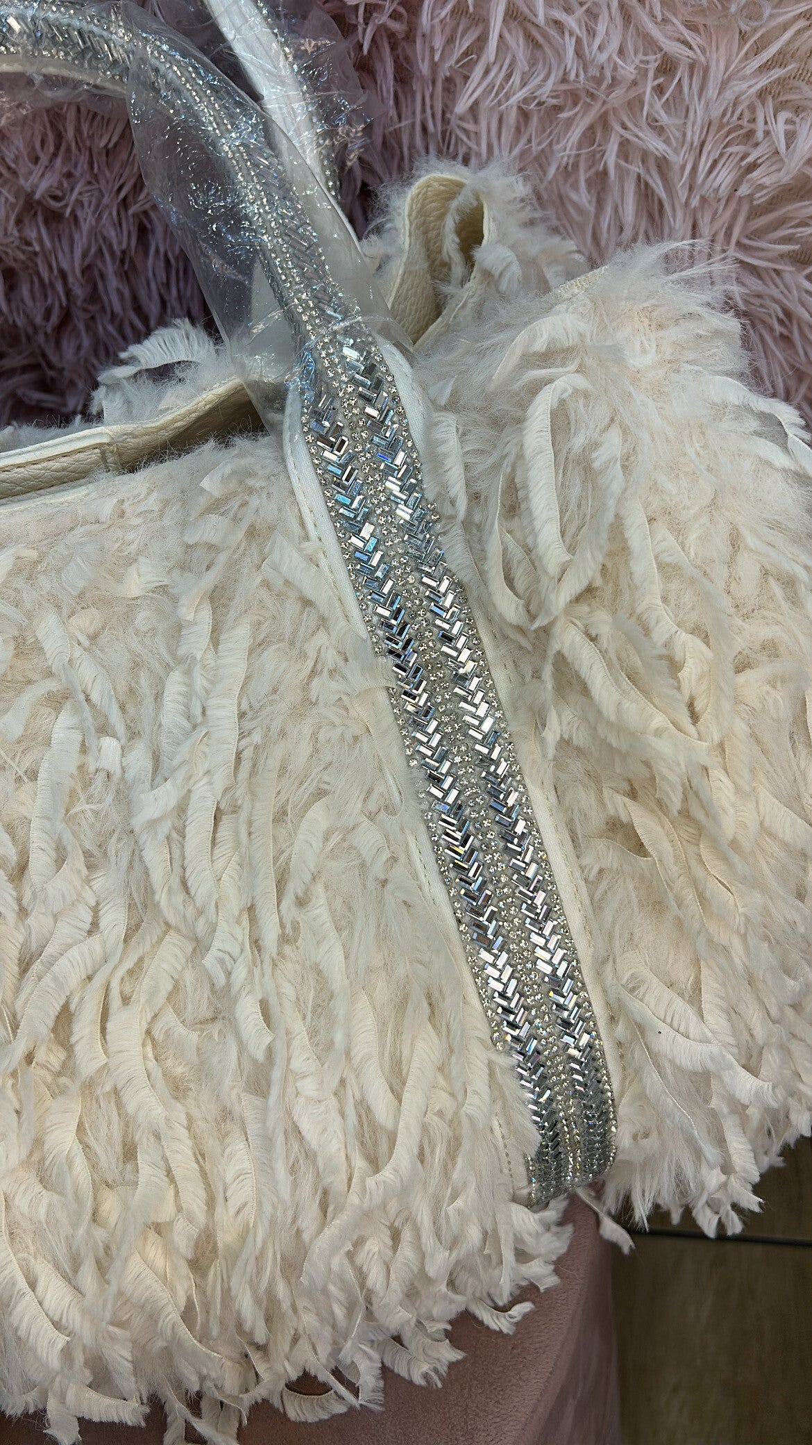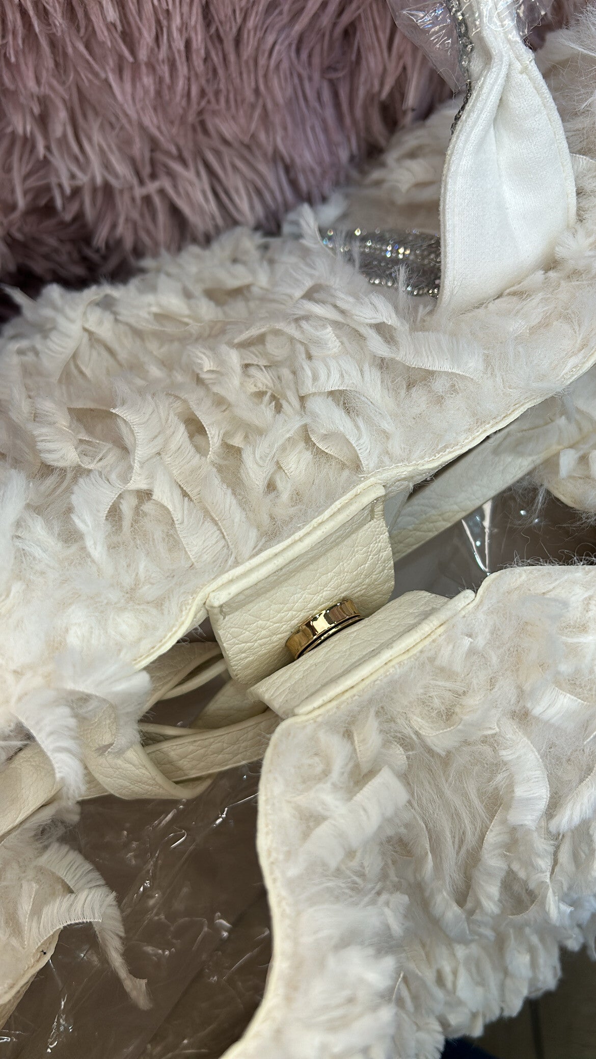 La borsa è interamente ricoperta da una frangia di pelliccia sintetica che le conferisce un aspetto "shaggy" voluminoso e soffice.