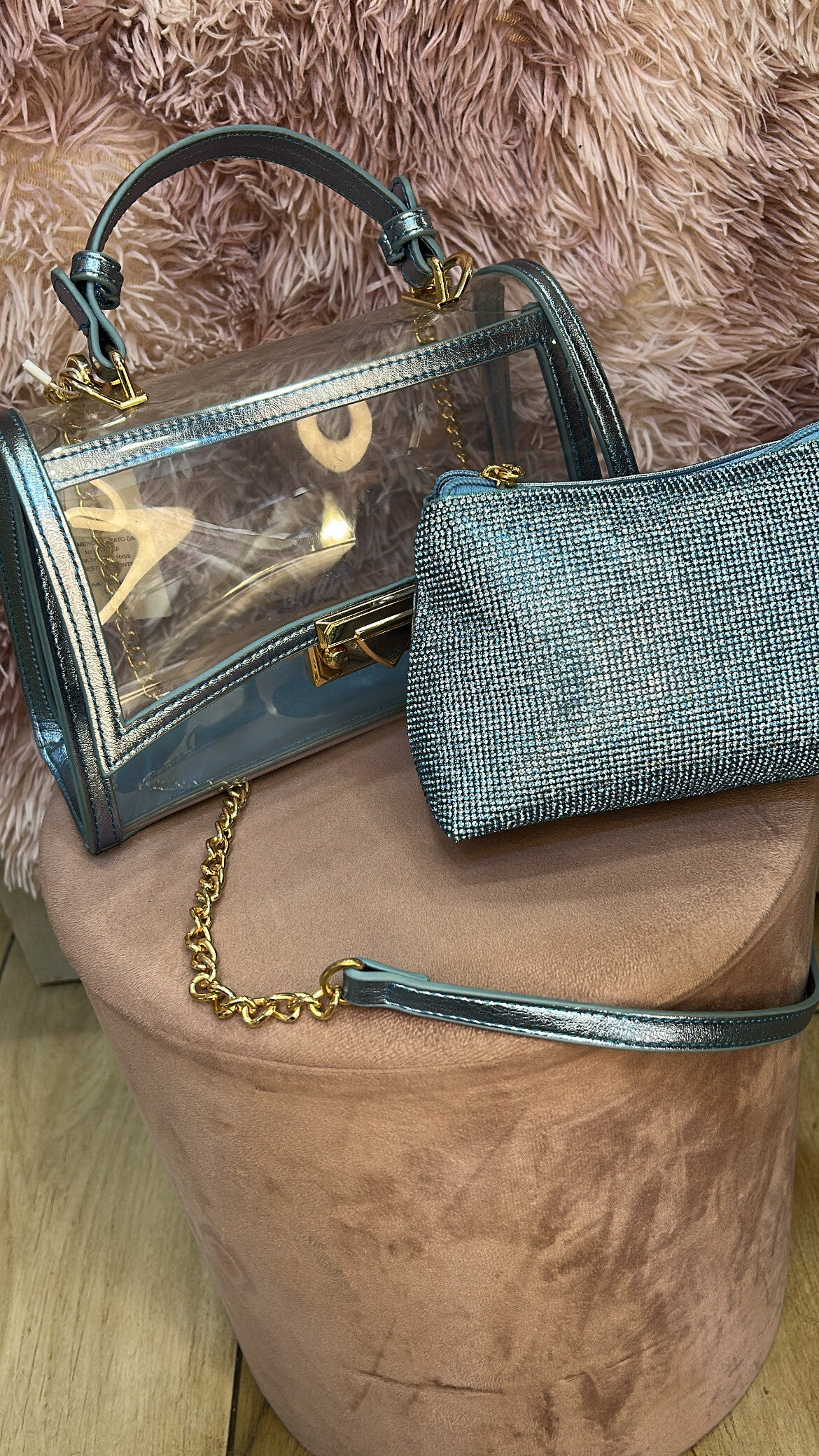 Design 2-in-1. La borsa principale è realizzata in PVC trasparente di alta qualità con profili in ecopelle azzurro polvere. Al suo interno custodisce una pochette coordinata interamente ricoperta di strass, perfetta per tenere al sicuro i tuoi oggetti personali e aggiungere un tocco di luce.