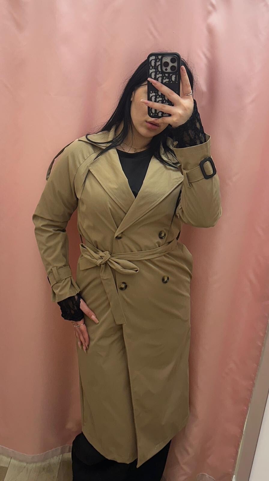 Trench classico a doppiopetto con bottoni animalié. Cintura in vita e ai polsi con dettagli tono su tono