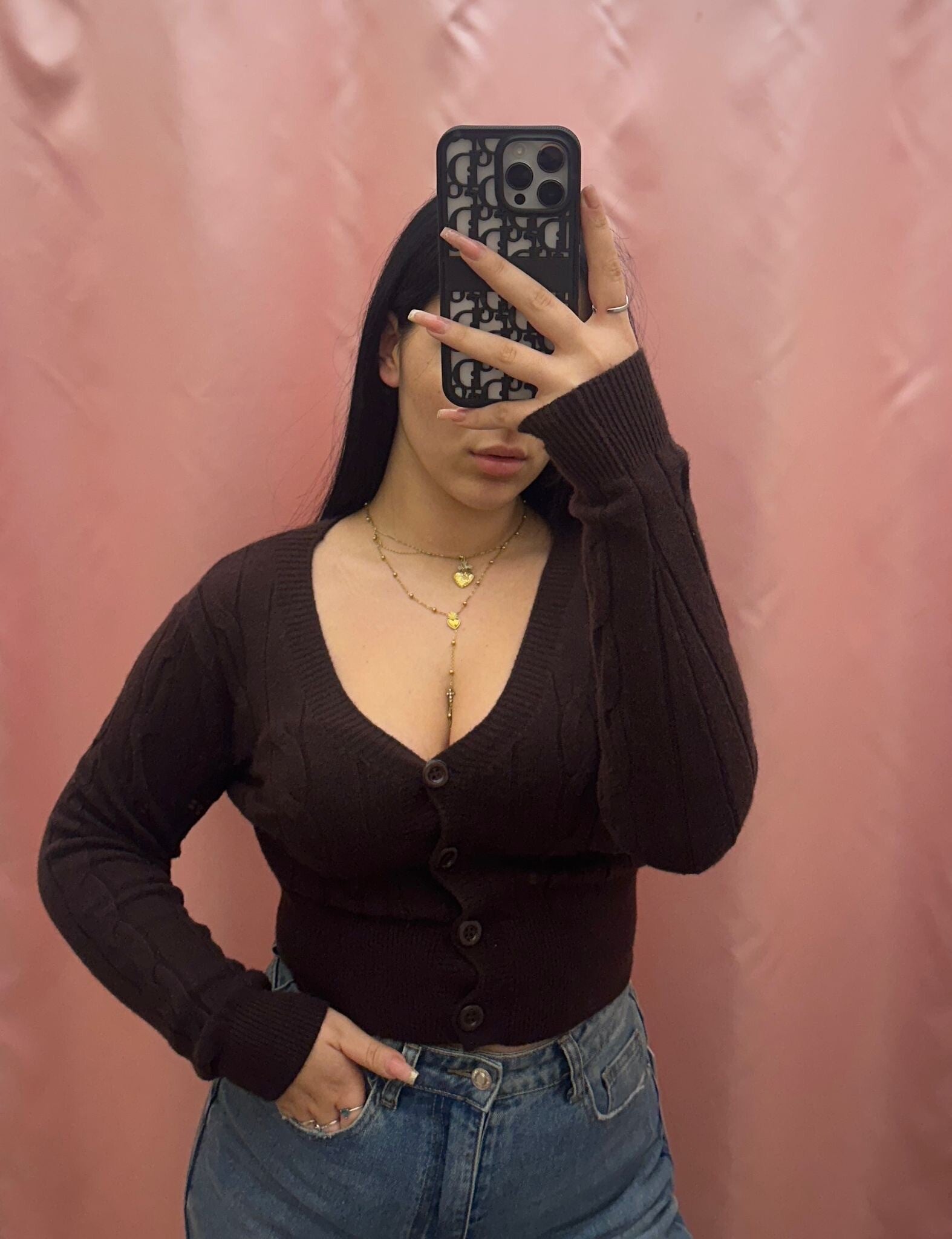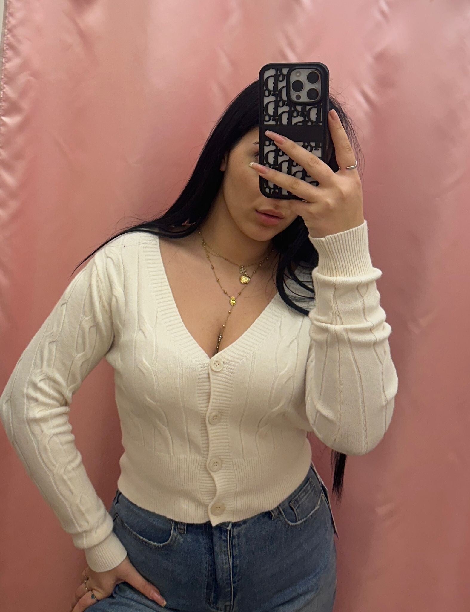 Cardigan con ricami a trecce verticali e bottoni tono su tono