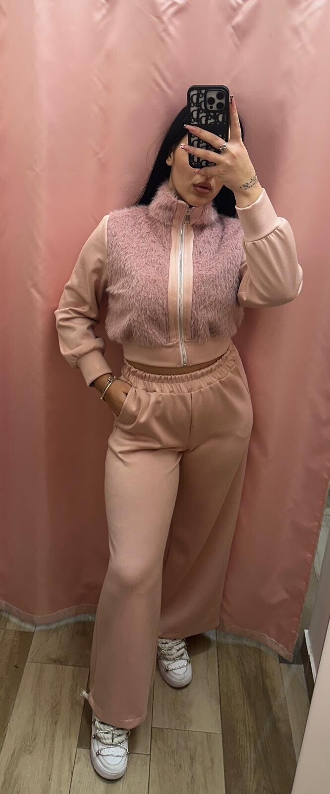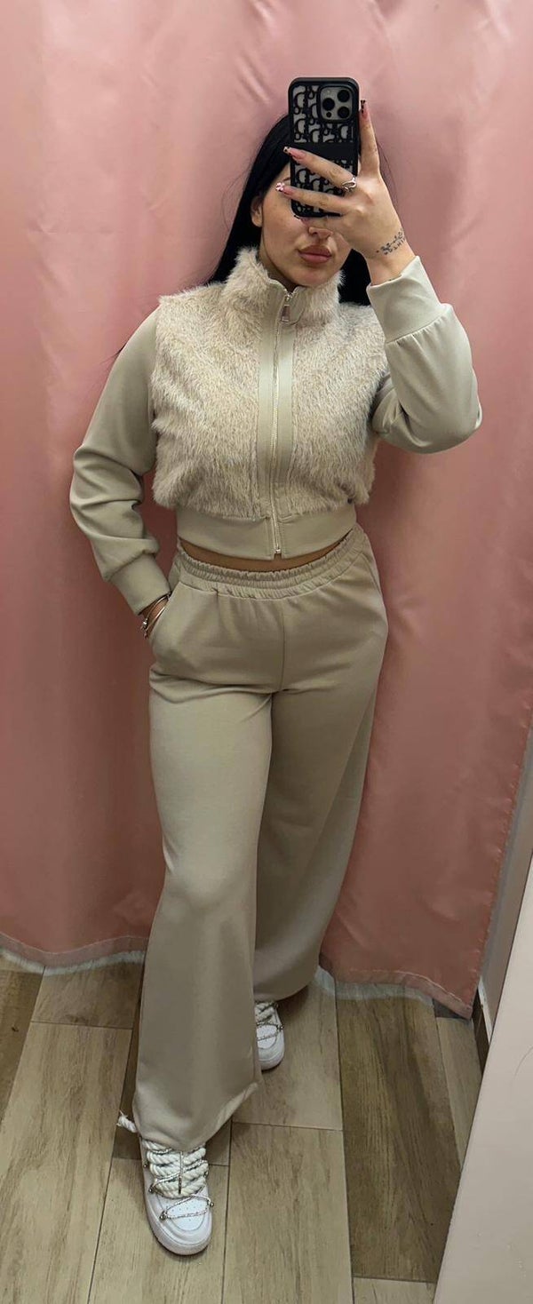 Coordinato con felpa cropped con zip integrale e collo alto, caratterizzata da un inserto frontale in eco-pelliccia a pelo lungo. Pantalone a vita alta con fascia elastica