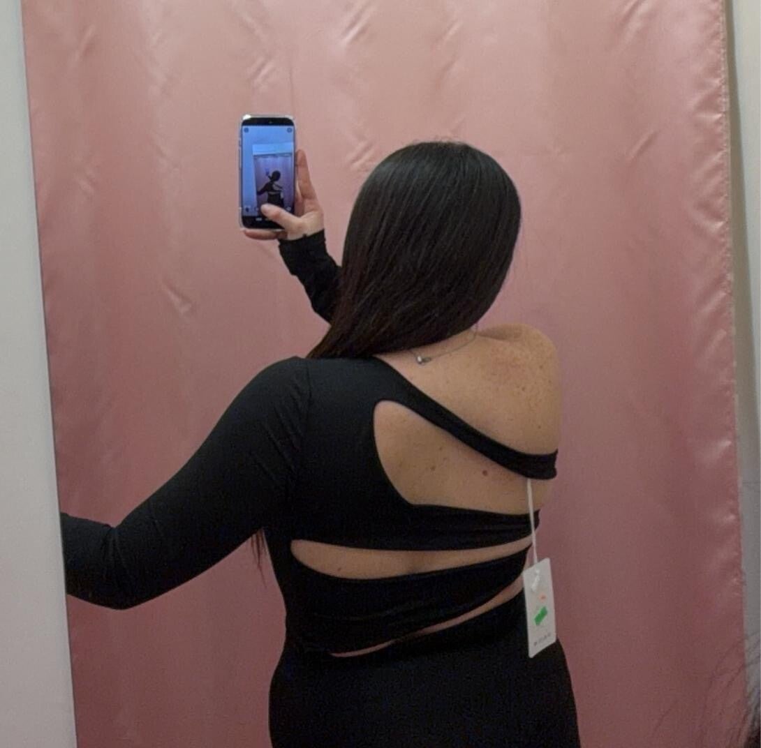 Vestitino a taglio monospalla con maniche lunghe. intreccio di cut-out asimmetrico nella parte posteriore