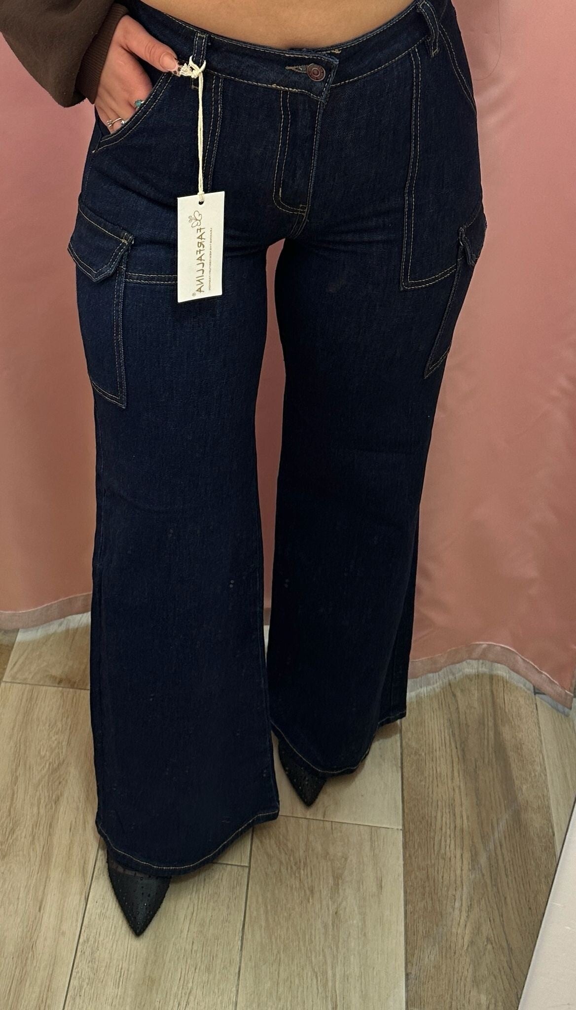 Jeans cargo con tasche laterali, impunture a vista e chiusura classica con bottone metallico.