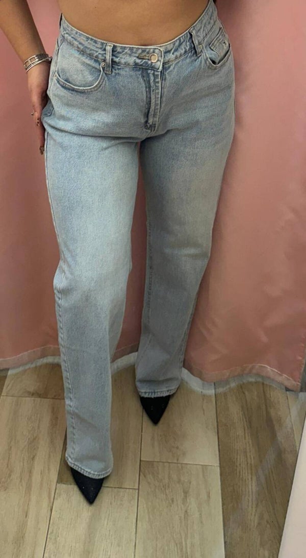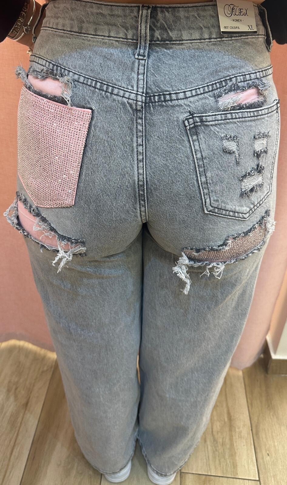 Jeans a vita alta semplici nella parte anteriore. Particolarità della tasca posteriore sinistra è interamente ricoperta di micro-cristalli rosa. strappi strategici sotto il gluteo e sulla parte superiore, arricchiti da un sottofondo in tessuto rosa che richiama la tasca glitterata.