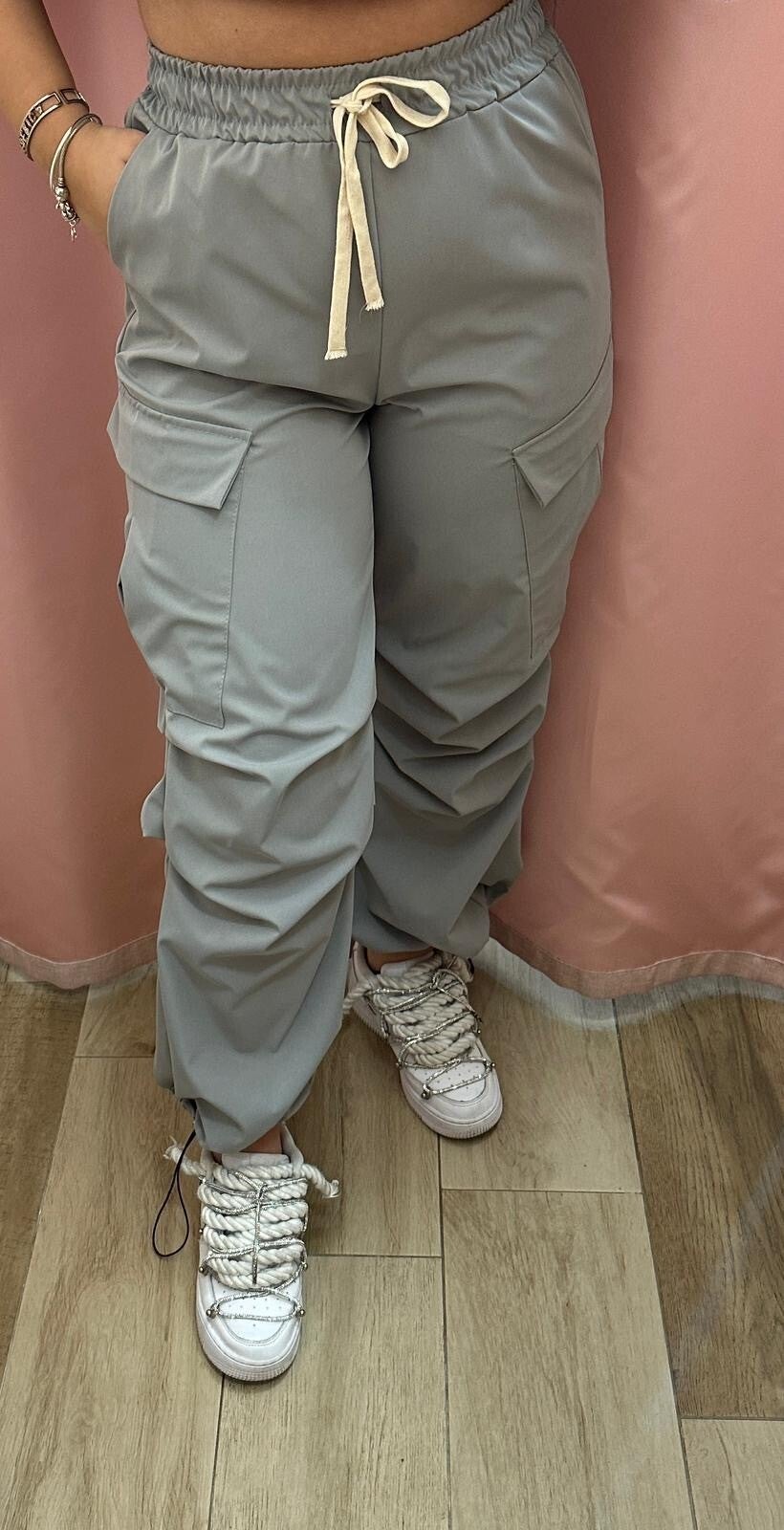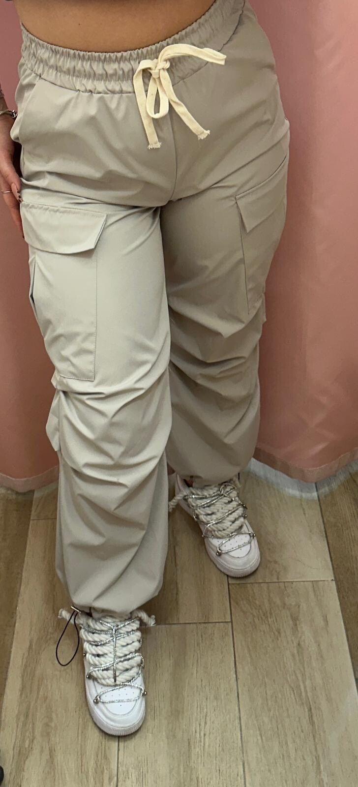 Pantatuta con tasche laterali a soffietto con patta. Cintura a vita alta elasticizzata con laccio e elastico alle caviglie