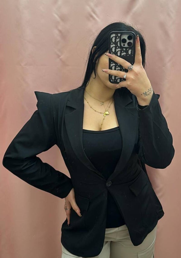 Giacca a blazer con spalline imbottite che terminano con una punta verso l'alto.