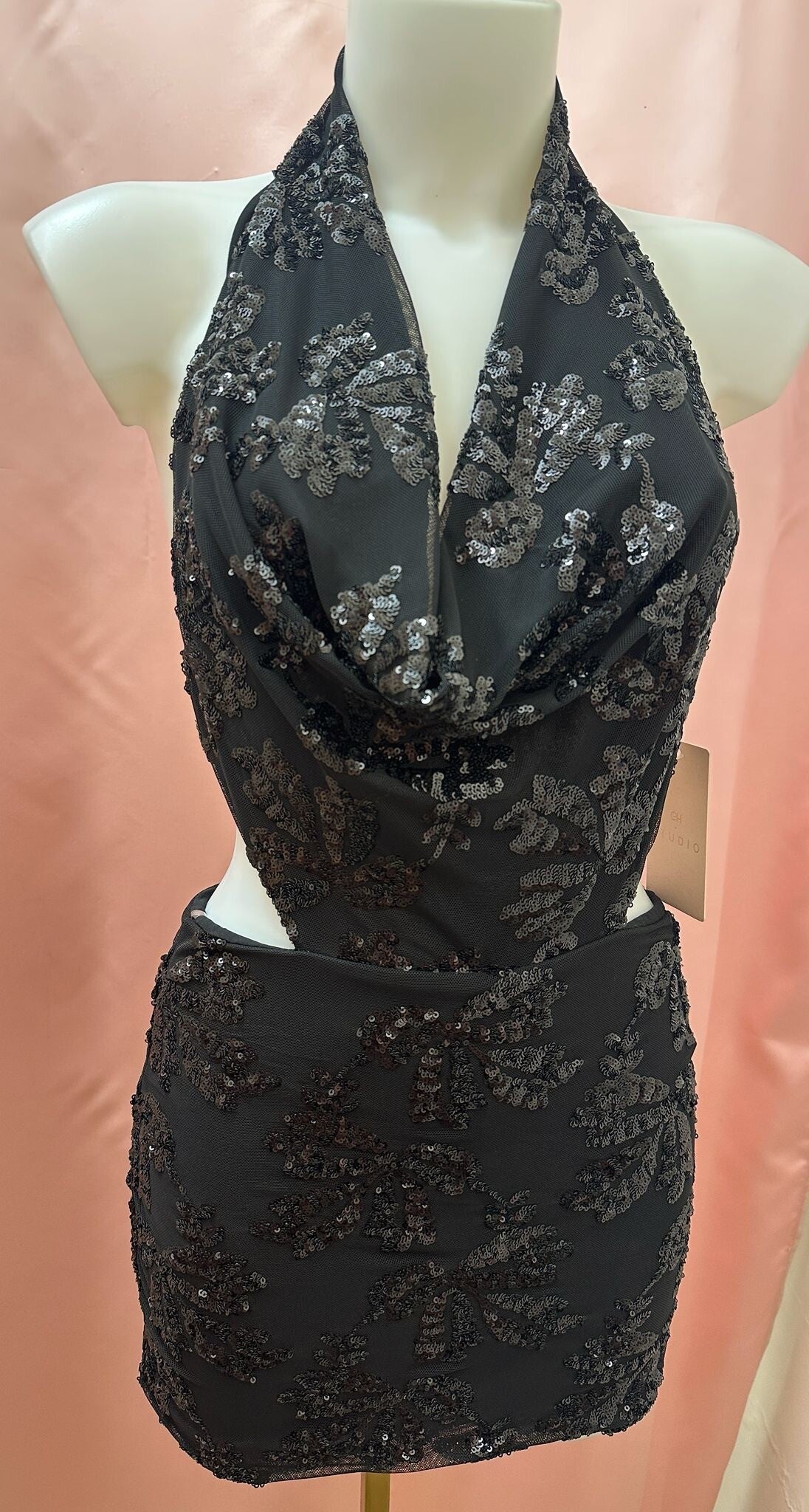 Vestitino corto con design cut-out sui fianchi. scollo a cappuccio morbido sul davanti, sostenuto da un'allacciatura a halter. Tessuto ricoperto da un motivo floreale realizzato con paillettes