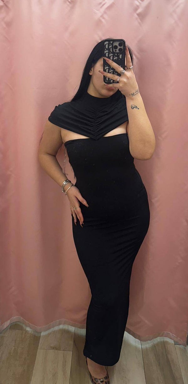 Abito a tubino con top a collo alto con un taglio a v-cut rovesciato sul davanti, che crea un'apertura cut-out sopra il seno.
