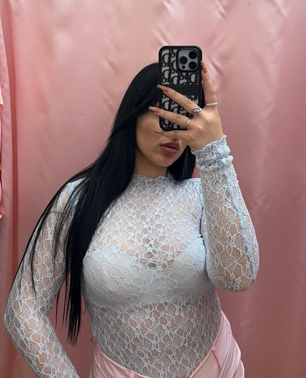 T-shirt in pizzo lavorato con un motivo floreale a rilievo. La trama è semi-trasparente. Maniche lunghe e collo a lupetto